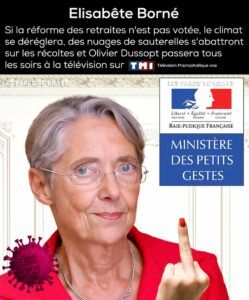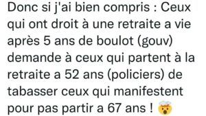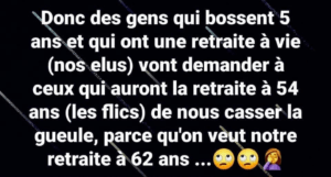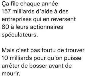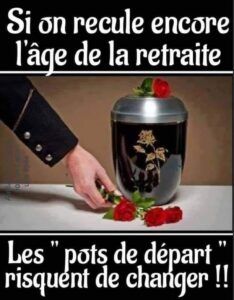 Réforme des retraites – humour et ironie 14 mai 2023 RAD Analyse et réflexion 0 Vu sur le Net (fautes d’orthographe comprises) ! Vous aimerez peut-être aussi :Nouvelle tartufferie à Lamastre / Retourtour plageC'est ballot !!!"En prison boire le ciel" lecture musicaleCommuniqué : ConférenceNouvel appel à mobilisations contre la réforme des retraites le 11 mars à Lamastre et en Drôme-Ardèc...humourironieRéformeretraites