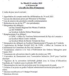 Réunion de la communauté de communes le 12 octobre 2021 9 octobre 2021 RAD Démocratie Locale 0 Réunion du conseil communautaireVous aimerez peut-être aussi :Assemblée Générale de l'Association Accueil Migrants de la Vallée du DouxLamastre - Pétition contre la fermeture de l'école de musiqueRéunion révision du POS (suite)Communauté de communes Lamastre - "Polémiquer ou dénoncer : Telle est la question" ?Lamastre - prochain bulletin municipal: le droit des élus d'oppositioncommunauté de communes pays de Lamastreréunion