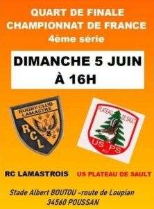 Après leur large victoire contre Carvin sur le score sans appel de 65 à 6, les orange et noir affronteront l’US Plateau de Sault (club de l’Aude) ce dimanche 5 juin 2022 pour le compte des quart de finale du championnat de France 4ème série.