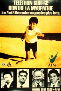 Sous l’égide de l’AFM (Association Française contre les Myopathies), Antenne 2 diffuse la première édition du Téléthon les 4 et 5 décembre 1987 : 181 327 459 francs de promesses de dons sont recueillis.