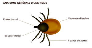 Les tiques sont des acariens qui vivent dans la végétation basse, où elles pondent, muent et guettent, au sommet des herbes, leur hôte pour prendre leur repas de sang.